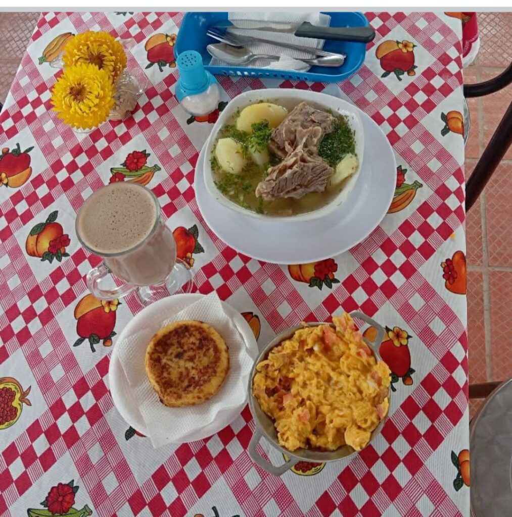 Disfruta un delicioso caldito de costilla bien calientico, perfecto para empezar el día con energía. Acompáñalo con un cremoso chocolate en leche, nuestras tradicionales arepas de maíz pelao hechas al fogón y unos huevitos al gusto, recién preparados para ti.