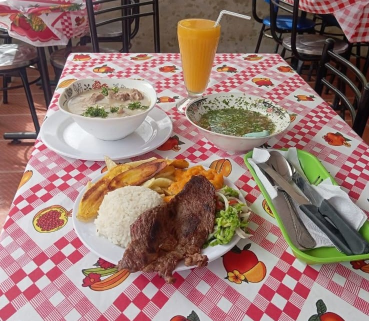 Prueba nuestro tradicional sancocho de gallina criolla, servido bien calientico, o disfruta una bandeja completa con arroz, papas a la francesa, plátano maduro, ensalada fresca y tu elección de carne asada o mojarra asada, preparada al momento.